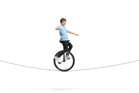 Full length shot of a boy riding a unicycle on a rope isolated on white background