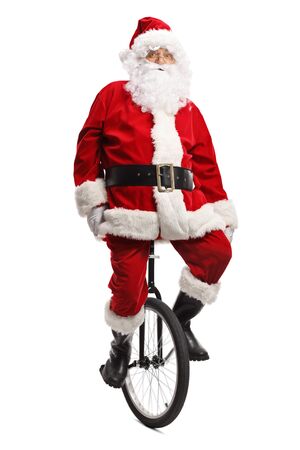 Full length portrait of santa claus on a monoc-cycle isolated on white background