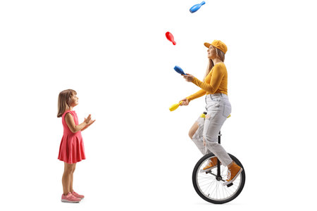 Little girl watching a young female riding a unicycle and juggling isolated on white background