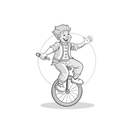 Cartoon boy on unicycle waving hand with happy smile