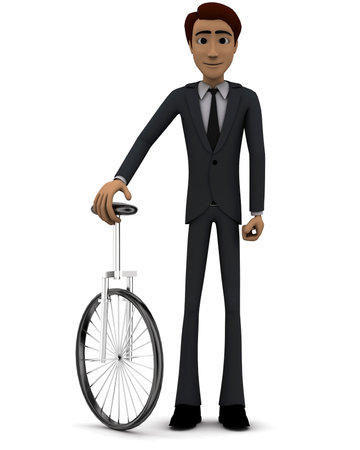 3d man with unicycle concept in white isolated background , front angle view