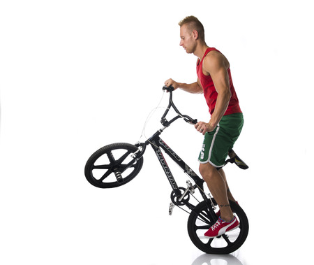 Handsome Athletic Young Man Doing Tricks and Popping a Wheelie on Bicycle in Studio with White Background