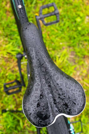 Closeup of a wet bicycle seat after rain of mountain bike.