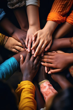 Multiracial hands joined together in a circle symbolizing unity, diversity and collaboration. Generative AI