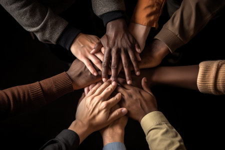 Group of diverse people putting their hands together in a circle against black background