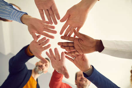 Group of senior and young multiracial business people joining hands showing unity and solidarity, view from below, warm toned low angle close up shot. Concept of mutual help, teamwork and team spirit
