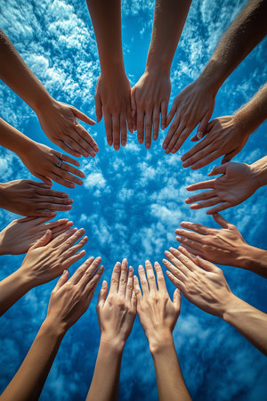Diverse hands reaching out towards a bright sky, symbolizing unity and connection.
