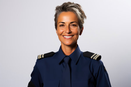 A close-up of a policewoman with a gentle expression, against a muted backdrop