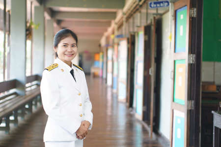 Thai teachers in official uniform focus on golden stripe shoulder accessory