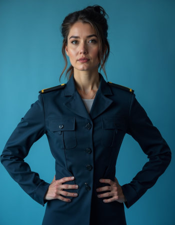 A young female Navy officer in uniform, confidently navigating a ship, representing strength and diversity in the military.