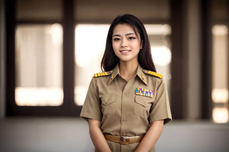 asian woman Thai teacher at school in khaki suit uniform, Generative AI