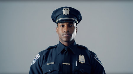 A dedicated police officer stands in full uniform, showing their commitment to public safety and law enforcement. The backdrop emphasizes their professional demeanor.