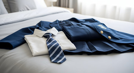 A neat school uniform consisting of a blue blazer, pleated skirt, white shirt, and striped tie laid out on a bed. The image conveys concepts of morning routine, discipline, and readiness for the school day.