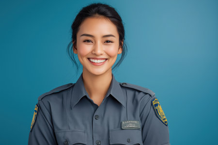 A bright, cheerful studio portrait of a beautiful Asian woman in a law enforcement uniform, smiling warmly and confidently at the camera against a blue background.