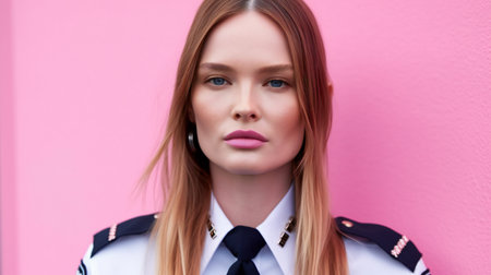 Close-up portrait of a beautiful young woman in uniform on a pink background