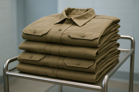 Neatly folded khaki uniforms stacked on a metal cart in a clean organized room with crisp lines and orderly arrangement.