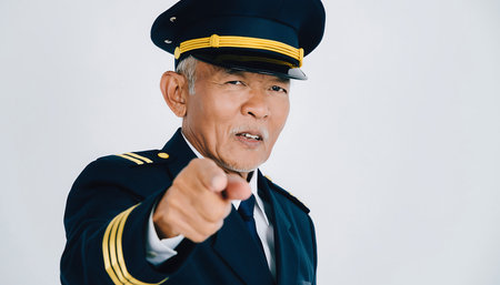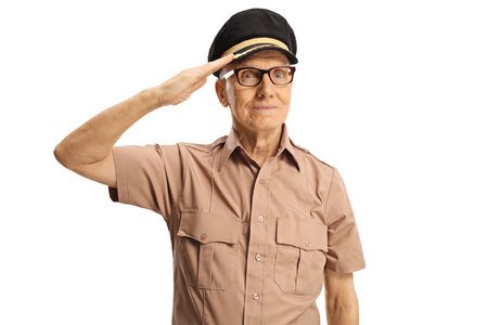 Confident airplane pilot saluting, wearing uniform and hat front view portrait, plane captain looking at camera. Civil aviator with airline wings badge on jacket, professional aircrew member