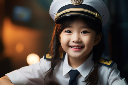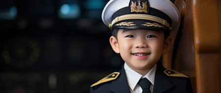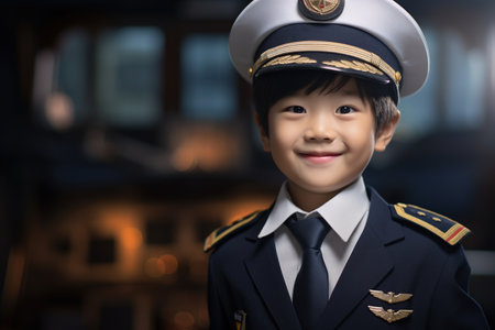 Cute asian boy wearing pilot hat and uniform. Selective focus.