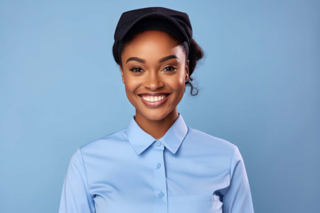 Confident female pilot in uniform smiling and looking up at sky, dreaming of flying