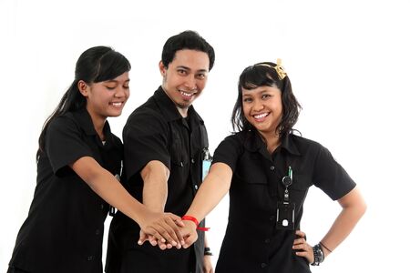 A young Indonesian government worker doing greeting gesture while smiling at camera.