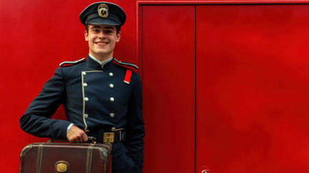 A bright and cheerful young bellhop, suitcase in hand, stands ready for a new journey, with a striking red background showcasing excitement and travel.