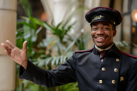 A man in a uniform is cheerfully making a peace sign gesture, A bellhop greeting guests with a warm smile and outstretched hand