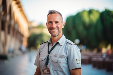 Portrait of smiling mature police officer standing on rooftop with cityscape in background