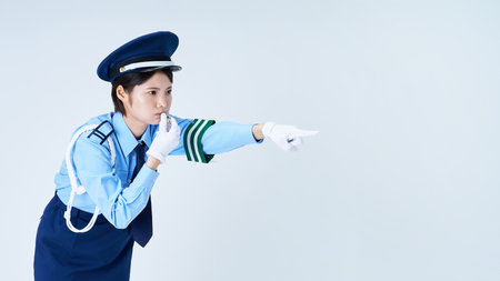 Beautiful young female Russian police officer in dress uniform shows signs with her hands on a white background. selective focus. Portrait