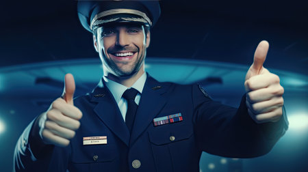 I love my job! Confident male pilot in uniform showing his thumb up and smiling while standing in front of airplane. Ai generative