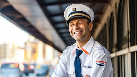 A smiling pilot in uniform waves at the airport apron at night. He wears a cap and a jacket with stripes on the sleeves. An airplane and lights are visible in the background, creating a professional aviation scene.