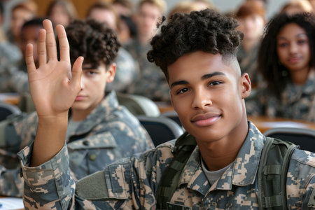 Smiling African American Soldier Raising Hand to Ask Question After Military Course Presentation