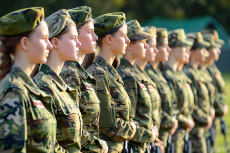 A row of young women in military uniforms stand at attention, wearing berets and camouflage fatigues.