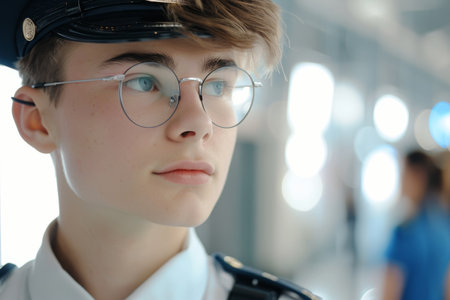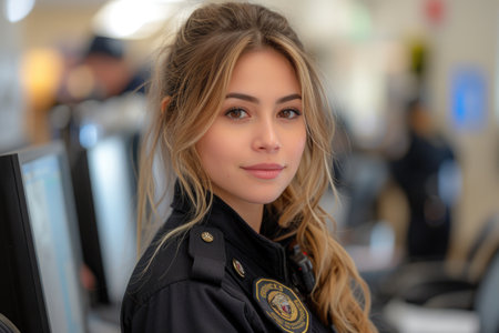 A young Caucasian policewoman in the precinct office radiates focus and approachability, her presence highlighted against the backdrop of daily law enforcement operations. A.I.