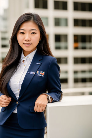 Confident female leader in navy uniform against blue background.