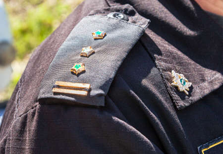 Samara, Russia - May 28, 2016: Shoulder straps with insignia on the bailiff's uniform. Selective focus