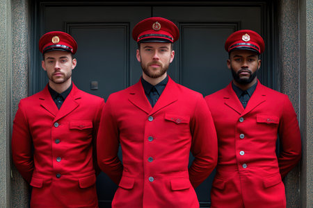 Three doormen in bright red uniforms stand together in front of a hotel entrance focused and ready to assist guests at dusk.