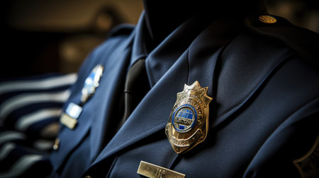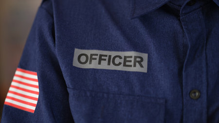 Cropped closeup of flag of United States of America on police uniform with inscription officer