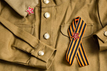 Banner. Military uniform and St. George's ribbon with a star. The concept of the Great Victory of 1941-1945 and the Day of the Defender of the Fatherland. A copy of the text space.