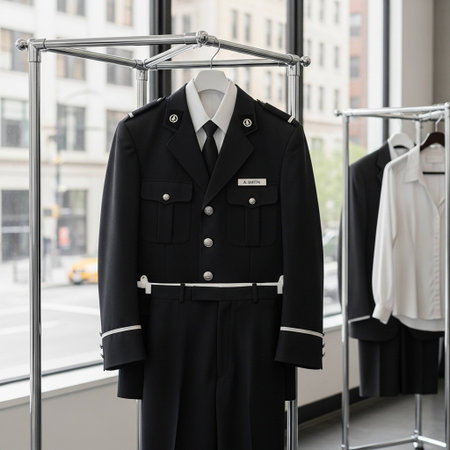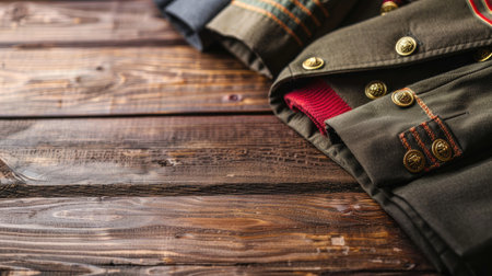 A side view of military uniforms elegantly displayed on a wooden background.