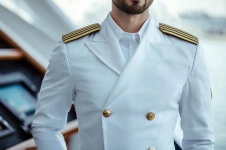 Male cruise ship captain standing confidently on the bridge of a luxury cruise liner, embodying authority and skill