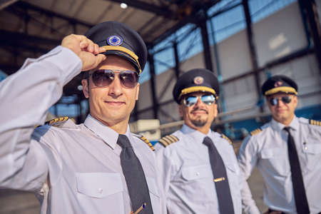 Cheerful airline workers chatting on the street