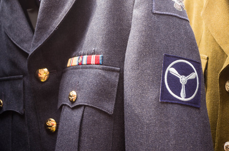 The closet of heroes. various military jackets hanging in a closet.