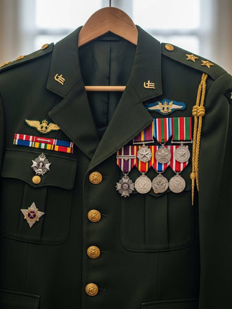 veterans medals displayed on an old uniform, created with generative ai