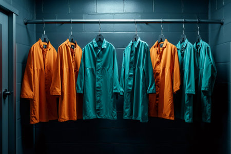 Orange and teal uniforms hanging on a clothes rack, evoking concepts of control and conformity