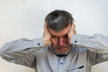 A mature man in a state of psychological stress in front of a light wall. A male with a short haircut and graying hair covers his ears with his hands. People, Human Emotions