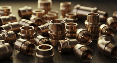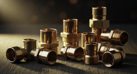 An intricate brass fitting with threading details is complemented by other metal connectors, highlighting precision craftsmanship and robust industrial plumbing tech