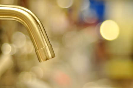 Brass plumbing product on a dark blurred background. In the foreground close-up visible carving.