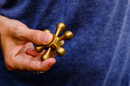 closeup of a young caucasian man playing with a brass fidget spinner.