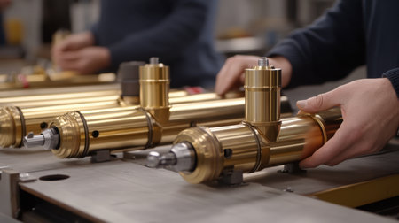 A skilled craftsman carefully assembles gold metal components in a modern manufacturing setting, showcasing precision and quality in engineering.