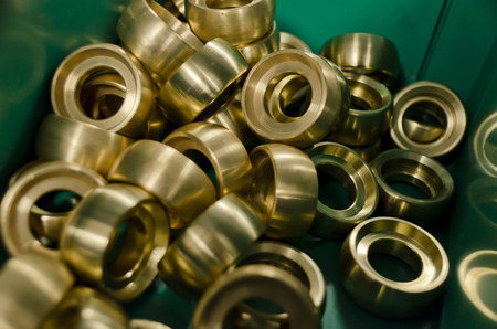 brass metal 3 pieces of golden light lined up and overlapping with threads inside. It is a piece of machinery in the industry.